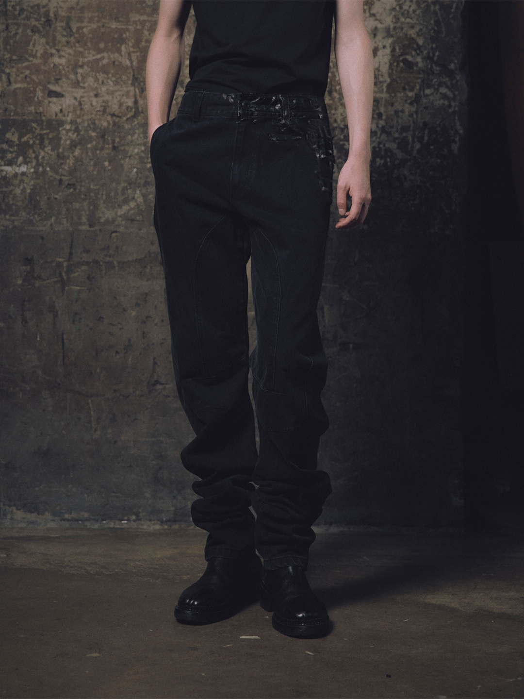 EXCAVATED HUMAN-SHELL DENIM PANTS (*SURFACE SERIES) / TAR BLACK